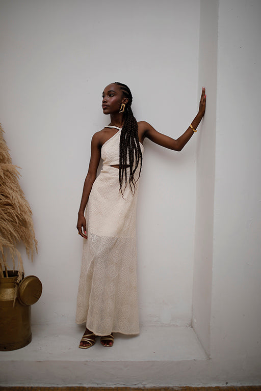 Vestido tejido con corte a la altura del busto, terminado del cuello estilo halter con amarre en la nuca. Largo a la altura de los tobillos y forro de falda por arriba de la rodilla.