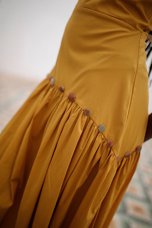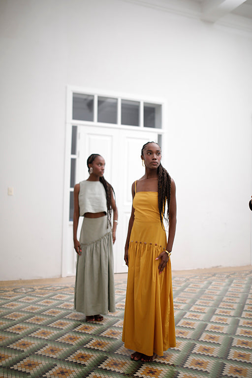 Vestido con corte recto en busto y tiras, falda hasta el tobillo y corredera invisible en la espalda. Se destaca por el acabado con piedras a la altura de la cadera que resalta la costura del fruncido.